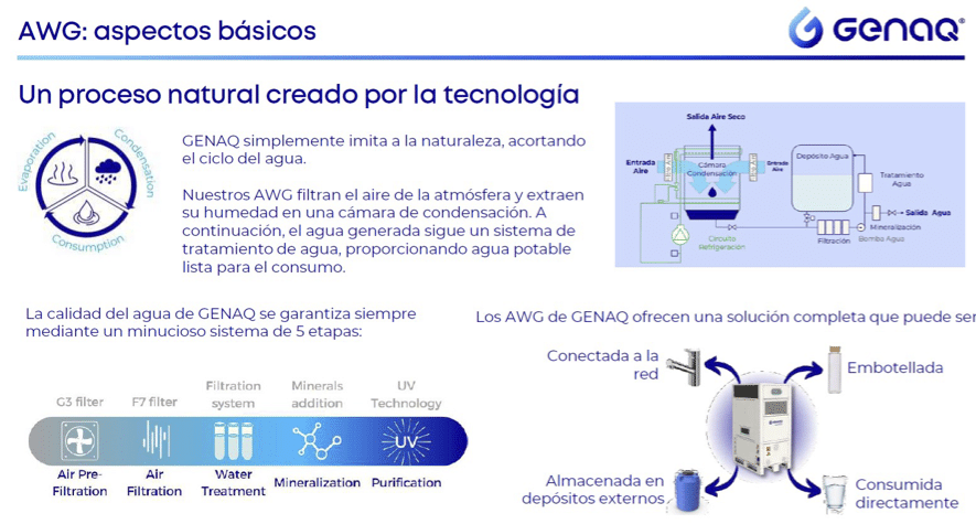 La idea tras esta tecnología es sencilla: se trata de captar el agua presente en el aire, la humedad atmosférica y transformarla en apta para el consumo humano. Para ello basta con condensarla, filtrarla para evitar la presencia de posibles patógenos y mineralizarla para equipararla al agua que consumimos diariamente.