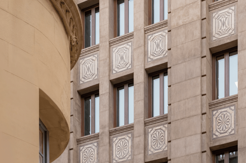 El edificio es de estilo noucentista ( movimiento artístico barcelonés que floreció entre 1905 y 1925 que se caracterizaba por su estilo clasicista, neoclásico, con énfasis en la armonía y el orden ). El edificio se articula por las líneas verticales de las puertas y ventanas, interrumpidas de forma discontinua por las horizontales de los balcones. Como otros de la misma Vía Laietana, se remite a la arquitectura de la Escuela de Chicago, caracterizada por su funcionalidad.